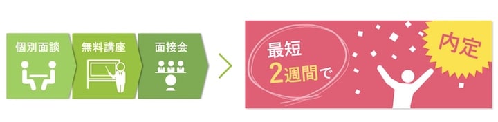 専任のアドバイザーによるサポートと実績のある運営会社だからこそできる企業への協力依頼で、最短で2週間とスピーディーに内定が獲得できるのもメリットです。