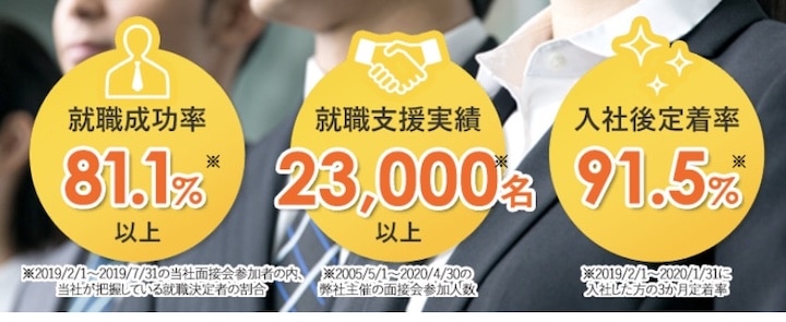 ビジネスマナーから履歴書の書き方、面接対策まで学べる就職講座を無料で利用でき、就職成功率は81.1%の高さ。就職後も手厚いサポートが継続されるため、入社後の定着率も91.5%の高さになっています。