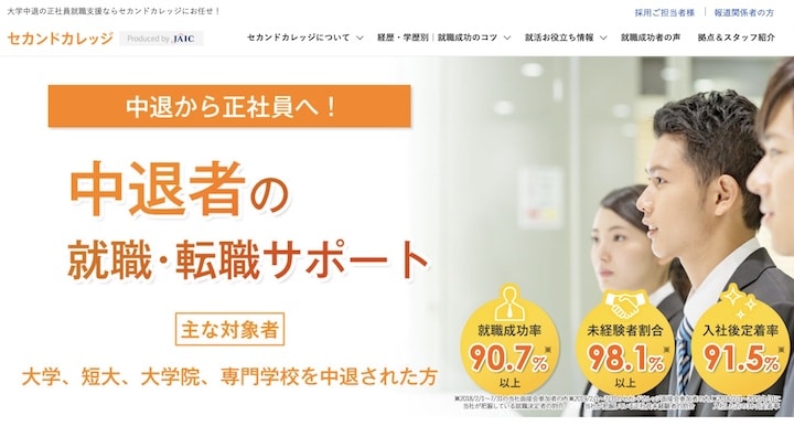 セカンドカレッジでは中退者が正社員の待遇で入社できるまで徹底サポートします。中退者の中で就職活動がうまくいっていない人におすすめのサービスです。