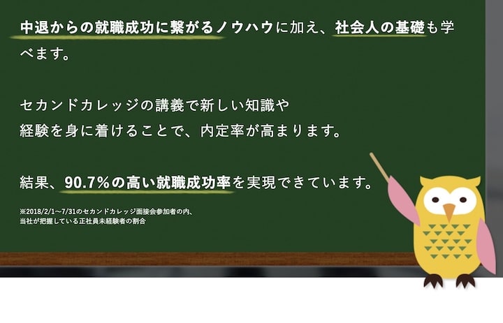 セカンドカレッジは大学や専門学校などを中退した人に向けた就職支援サービス。専任のアドバイザーがつき、面接サポートや新社会人向けの講座招待など、無料で使えるサービスを提供しています。