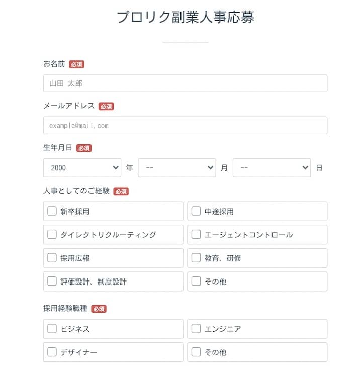 応募ページが開くので、「名前」「メールアドレス」「生年月日」「経験」「現職」などの必要情報を記載します。
