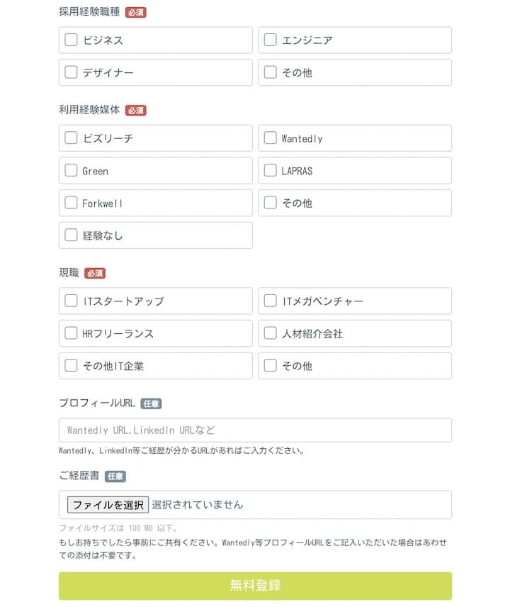 プロフィールURLや経歴書も任意で入力できます。大きなアピール材料となるのでぜひ入力しましょう。入力が完了したら「無料登録」ボタンをクリックして登録完了です。
