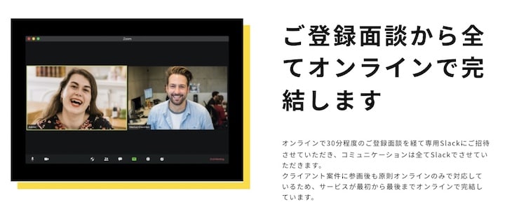 面談はオンラインで30分程度。面談後、専用Slackに招待されます。その後の担当者とのやりとりはすべてSlackで行われます。