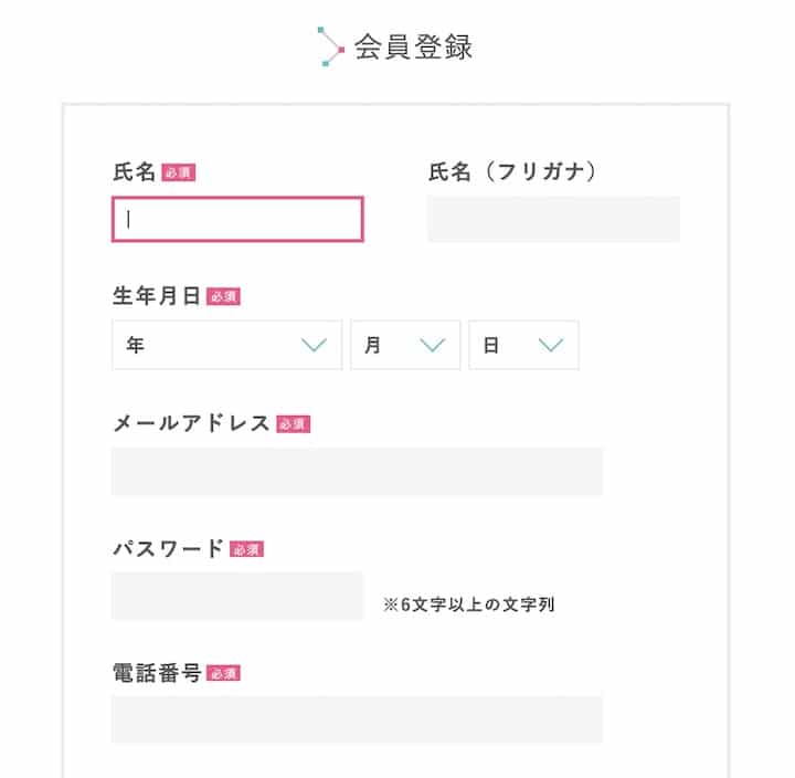 名前、生年月日、メールアドレス、パスワード、電話番号、性別、業務経験の有無、希望稼働時期、最寄り駅、希望報酬