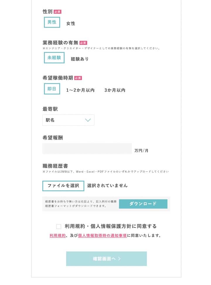会員登録する場合は、以下の項目を入力し、職務経歴書をアップロードしましょう。