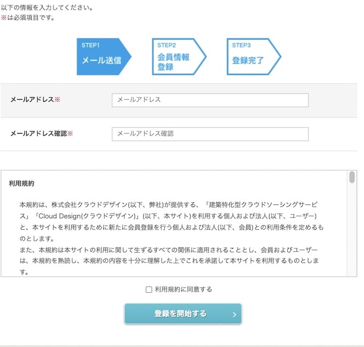 公式ホームページの「無料会員登録ボタン」から会員の登録を行いましょう。メールアドレスを入力すると、そのメールアドレス宛に本登録の案内メールが来ます。
