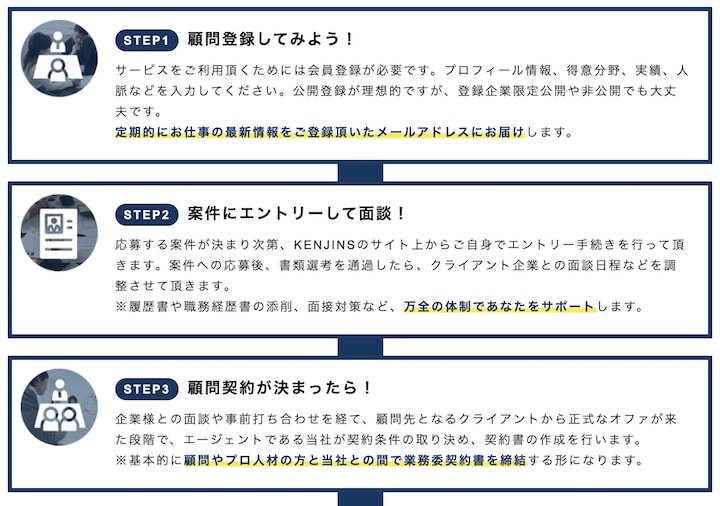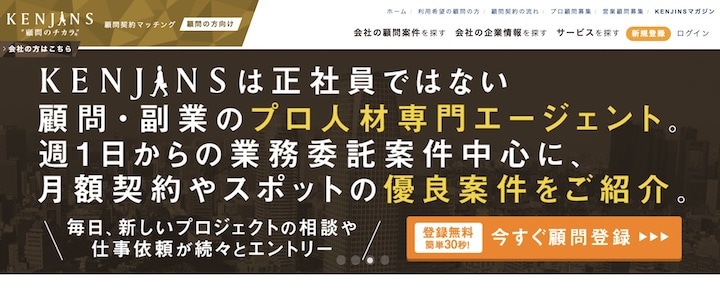 KENJINSとは、フリーランスコンサルタントを対象にしたダイレクトソーシングサービスです。ダイレクトソーシングサービスとは、企業の経営者や採用担当者が専用のWEBサイトを通して自ら優秀な人材をヘッドハンティングできるサービスのこと。