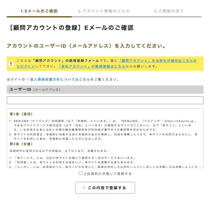 まずは、KENJINSの公式HPにて「顧問登録」をクリック。メールアドレスを登録するだけなので、簡単に登録できます。