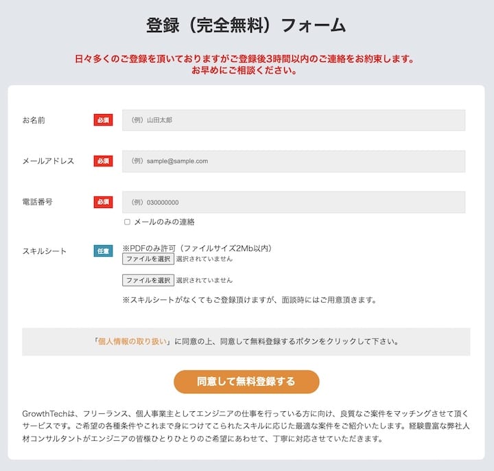 公式サイトの「登録(完全無料)フォーム」から必要事項を記入します。