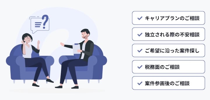 独立前の会社員の人はフリーランスとしての働き方の相談も受け付けています。テックビズフリーランスでは過去に独立経験がある担当者が話を聞いてくれるので、気になることがあれば何でも相談しましょう。