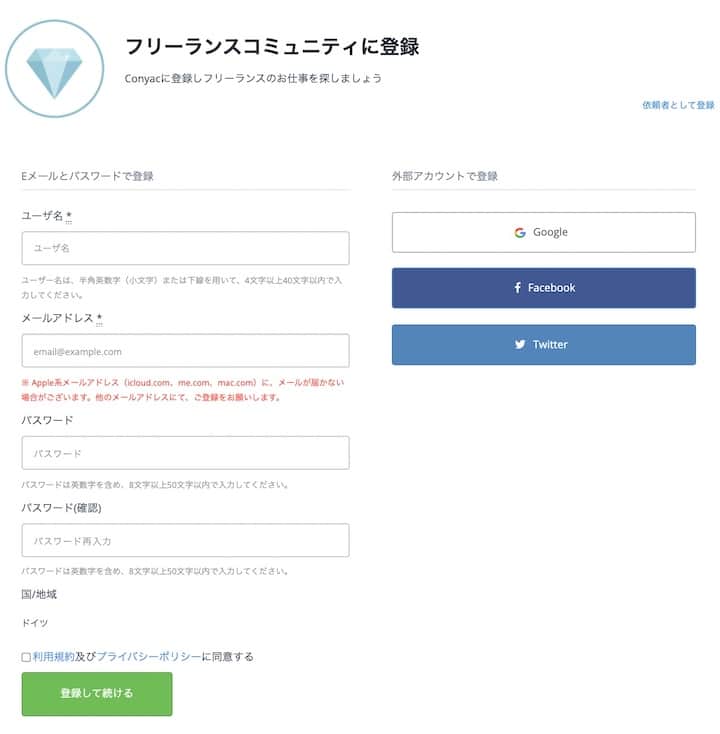まずはConyacの公式ホームページの「無料会員登録」から必要事項を入力し、会員登録します。