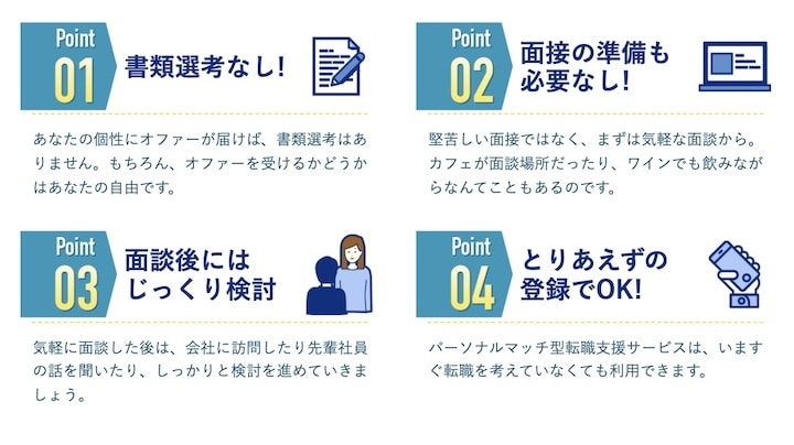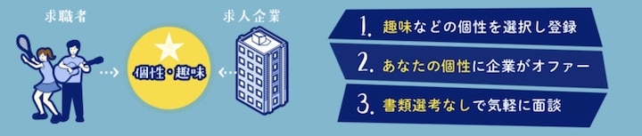 さらにアッテミオファーは面倒な書類選考や面接対策などを必要としません。応募者の個性や趣味と言ったパーソナルな部分を前面に出して企業に興味を持ってもらい、面談して選考が進めば内定という流れです。