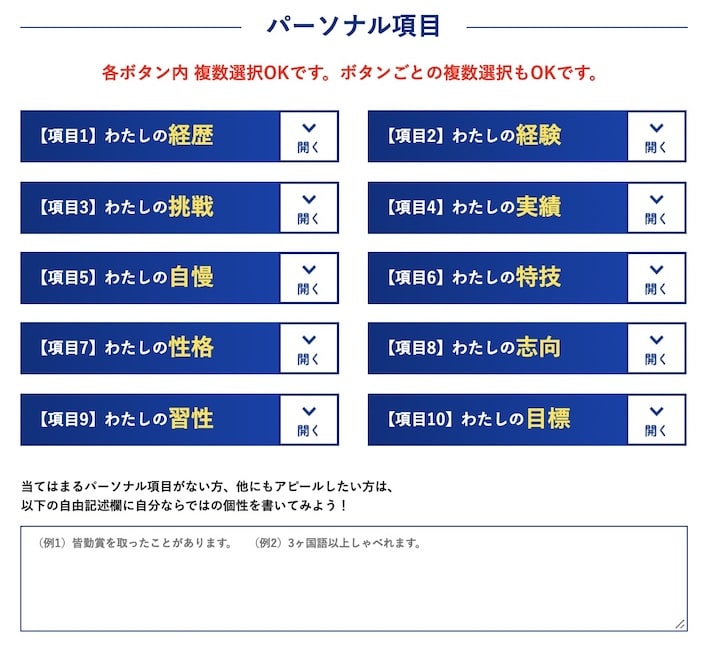 登録フォームには自分がこれまでやってきたことのパーソナル項目が10個あります。
