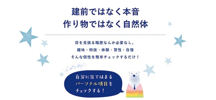 パーソナルな部分を見てもらうことで自分という人間どんな考え方を持っていて、どんな性格なのかアピールします。作成するプロフィールは自分が当てはまるパーソナルな項目にチェックを入れるだけです。