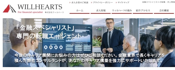 ウィルハーツは金融業界に特化した転職エージェントです。外資系/国内有力金融機関、証券会社、メガバンクのほか、M&A仲介会社や税理士法人など幅広い企業の求人案件を保有しています。