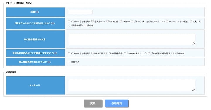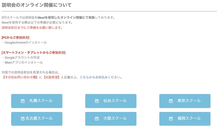 まずは0円スクールのサイトにアクセスし、お問い合わせフォームをクリック。