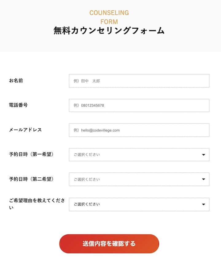 Code Villageの公式HPトップの「オンライン無料カウンセリングはこちら」から、無料カウンセリングの応募フォームへ進みます。