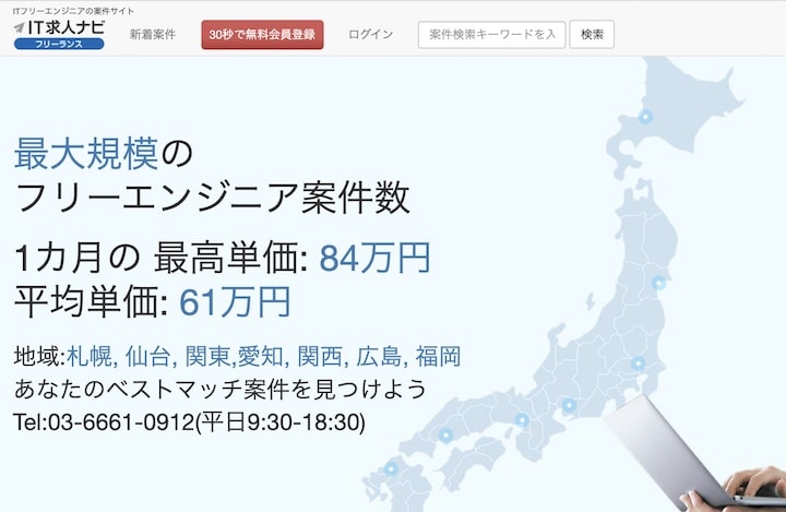 IT求人ナビ フリーランスは案件の月間平均単価は60万円と公開されており、フリーランスでも十分な収入を得られる点がメリットです。