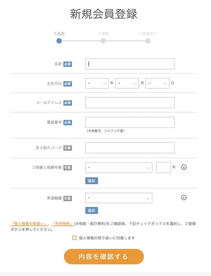 以上を入力し、「個人情報の取扱いに同意します」にチェックを入れて内容を確認しましょう。
