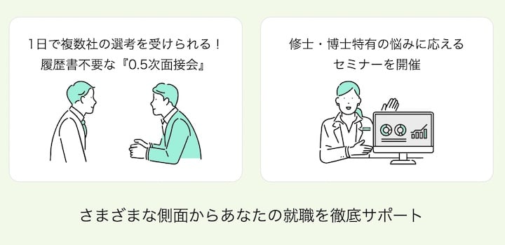 自分で掲載企業を見て、自身の研究が生かせる企業や研究機関を探すのは至難の業。その状況を解決するのが就職エージェントの機能です。