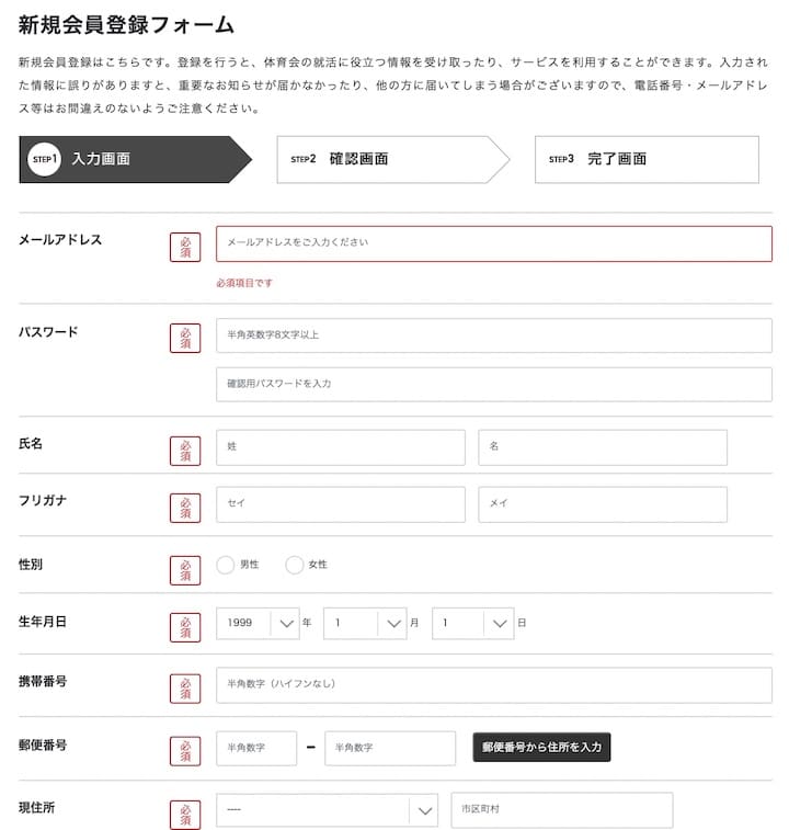 会員登録は入力画面から確認画面、完了画面というステップになっています。