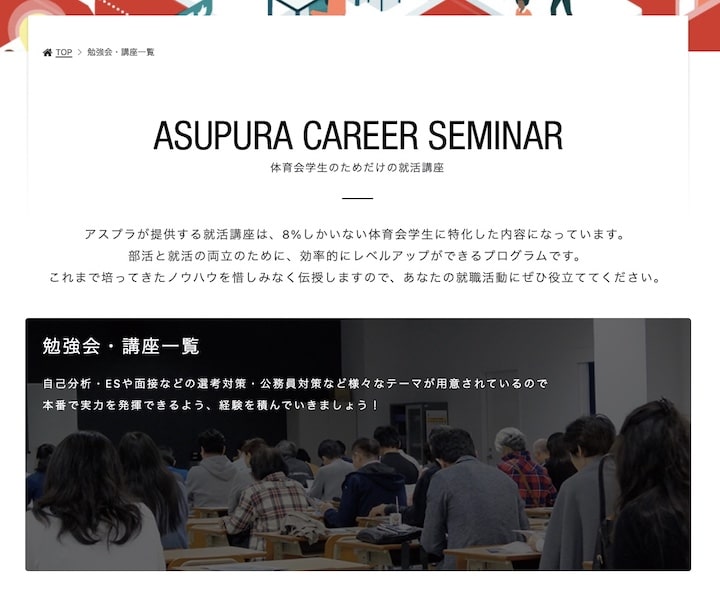 体育会限定の合同説明会や一般公開されていない企業説明会などアスプラ会員限定のイベントやセミナーも開催。