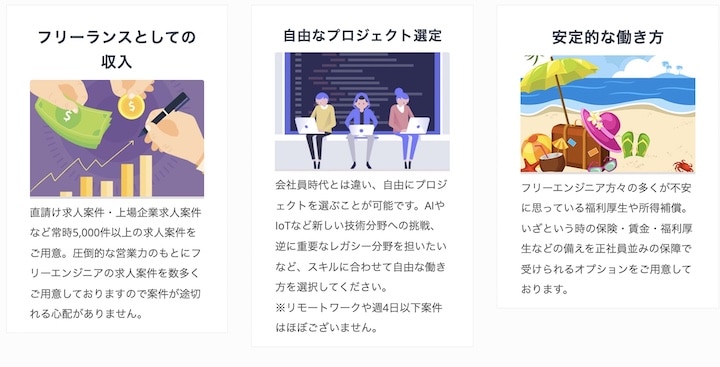 フリーランスでも安心して働ける環境づくりを目指して、所得補償や福利厚生サービスも充実。IT業界に精通したコーディネーターが丁寧にサポートしてくれます。