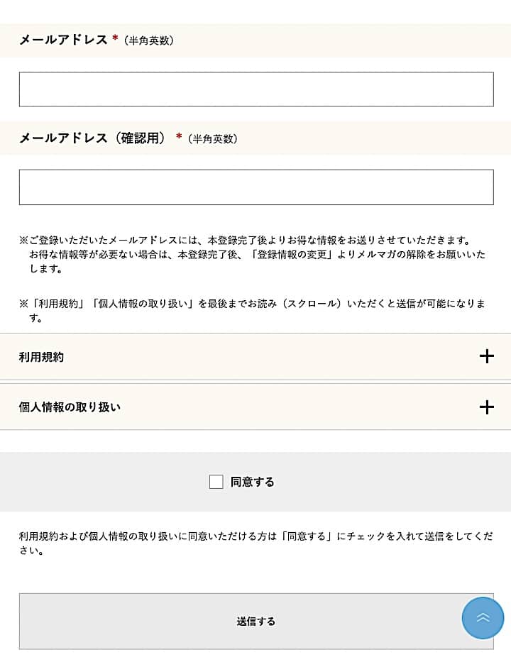 上記を記載し、「利用規約」「個人情報の取り扱い」を確認したのち、「同意する」にチェックを入れて「送信」ボタンを押します。