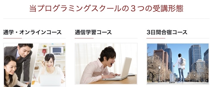 日本プログラミングスクールでは、通学・オンライン・通信学習・宿泊の4つの受講方法があります。
