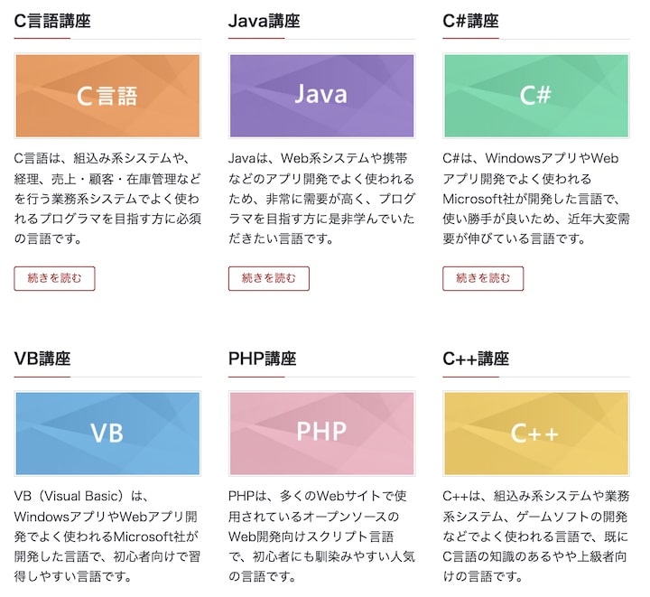 母体がソフトウェア会社のため、スクールで教えてくれる言語も充実しています。学べる言語は以下の通りです。